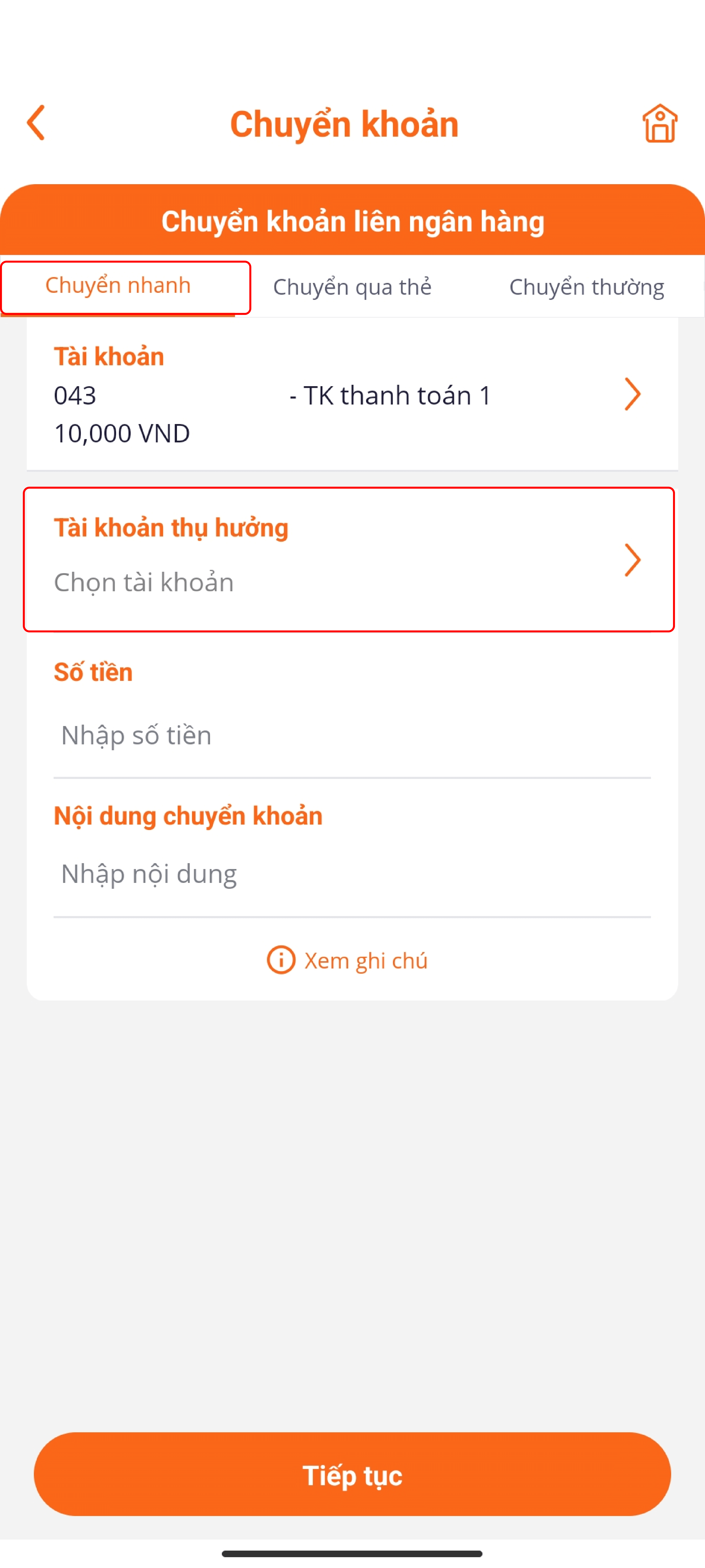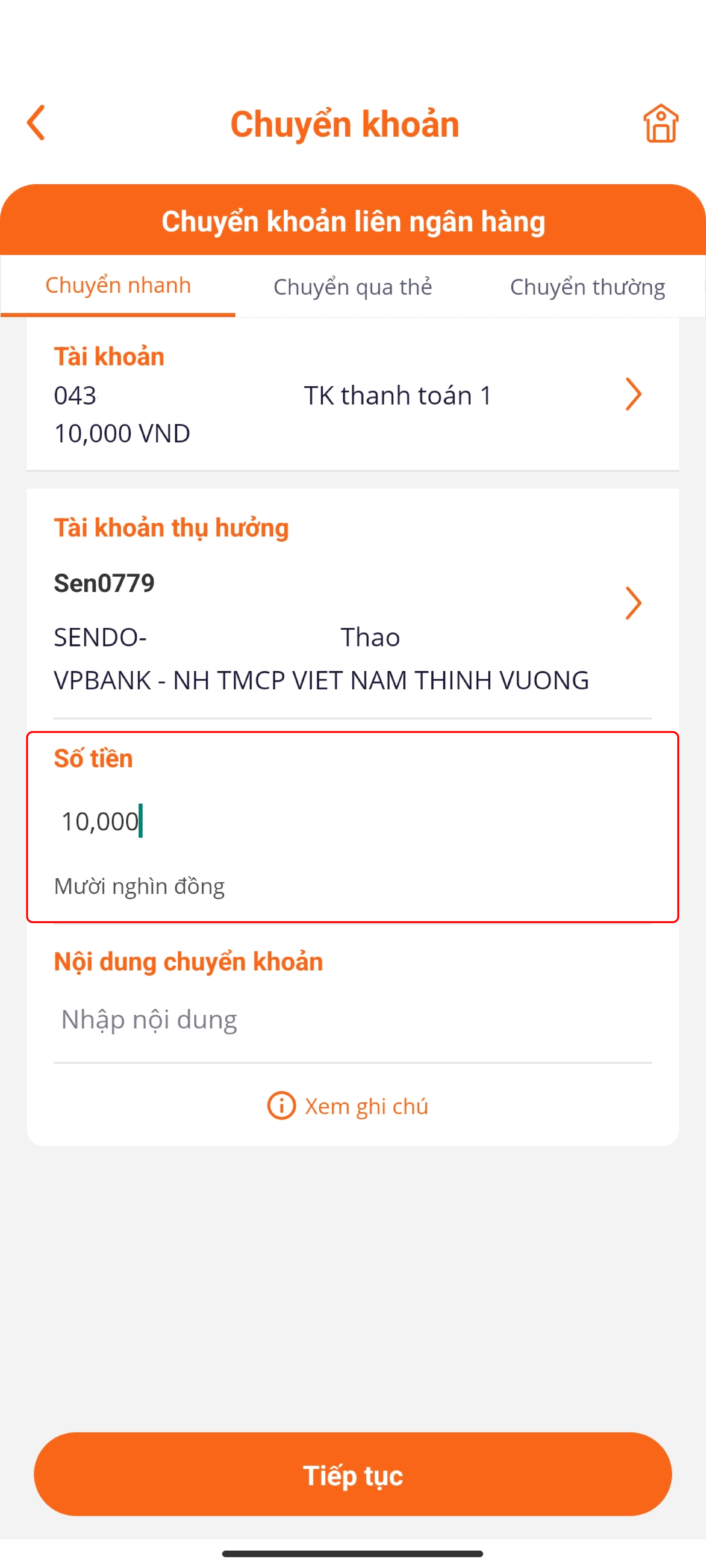 Bước 4: Nhập số tiền mong muốn chuyển (tối thiểu 10.000đ)