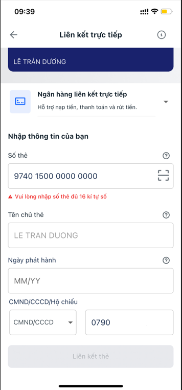 Kiểm tra Tên và Số CCCD đã trùng khớp với thông tin đăng ký ngân hàng Vietinbank thì bấm Liên kết thẻ