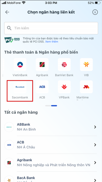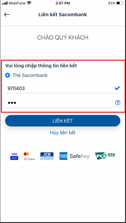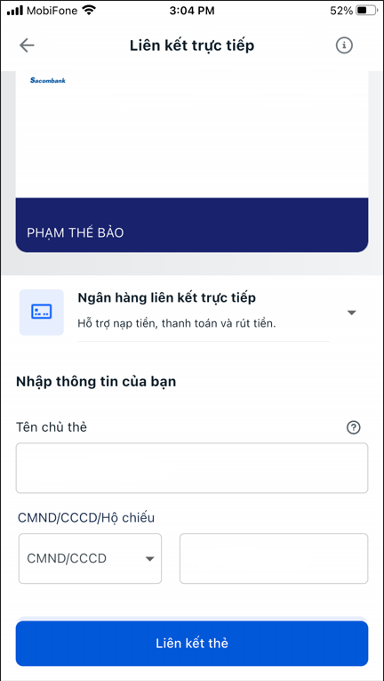 Kiểm tra Tên và Số CCCD đã trùng khớp với thông tin đăng ký ngân hàng Sacombank thì bấm Liên kết thẻ