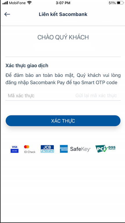 Bước 4: Lấy mã xác minh từ Sacombank Pay hoặc SMS OTP (tùy phương thức xác thực bạn đăng ký với ngân hàng)